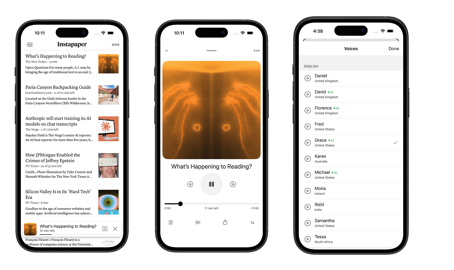 AI Voices are available on Instapaper iOS 9.4 with a Premium subscription. Android support will be coming soon!