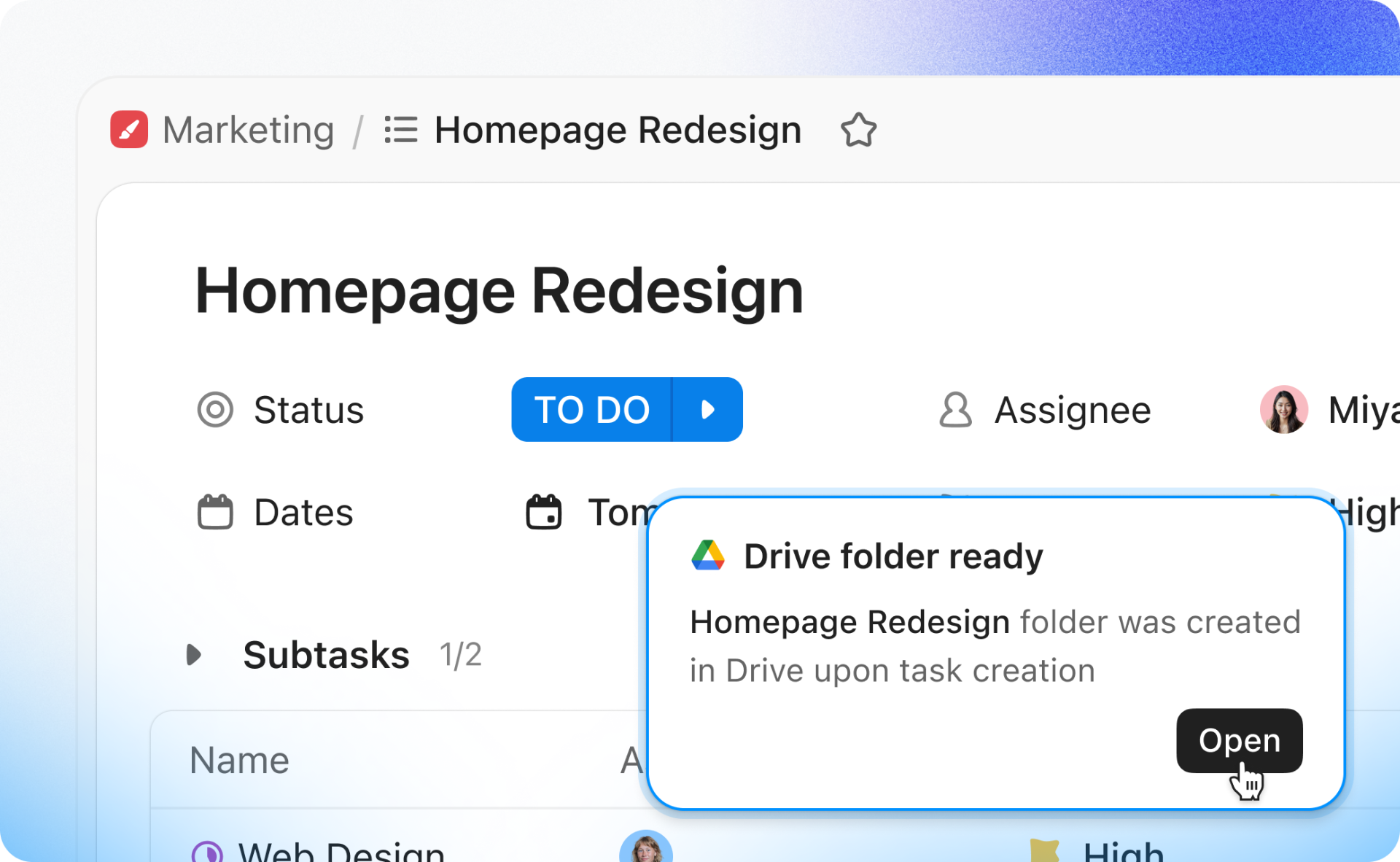 Google Drive Automations connect ClickUp and Google Drive. New triggers kick off ClickUp Automations when a file or folder is created in Google Drive, like alerting reviewers via comment. New actions automatically create a Google Drive folder or Doc when a ClickUp Automation fires, like spinning up a shared folder when a new task is created.