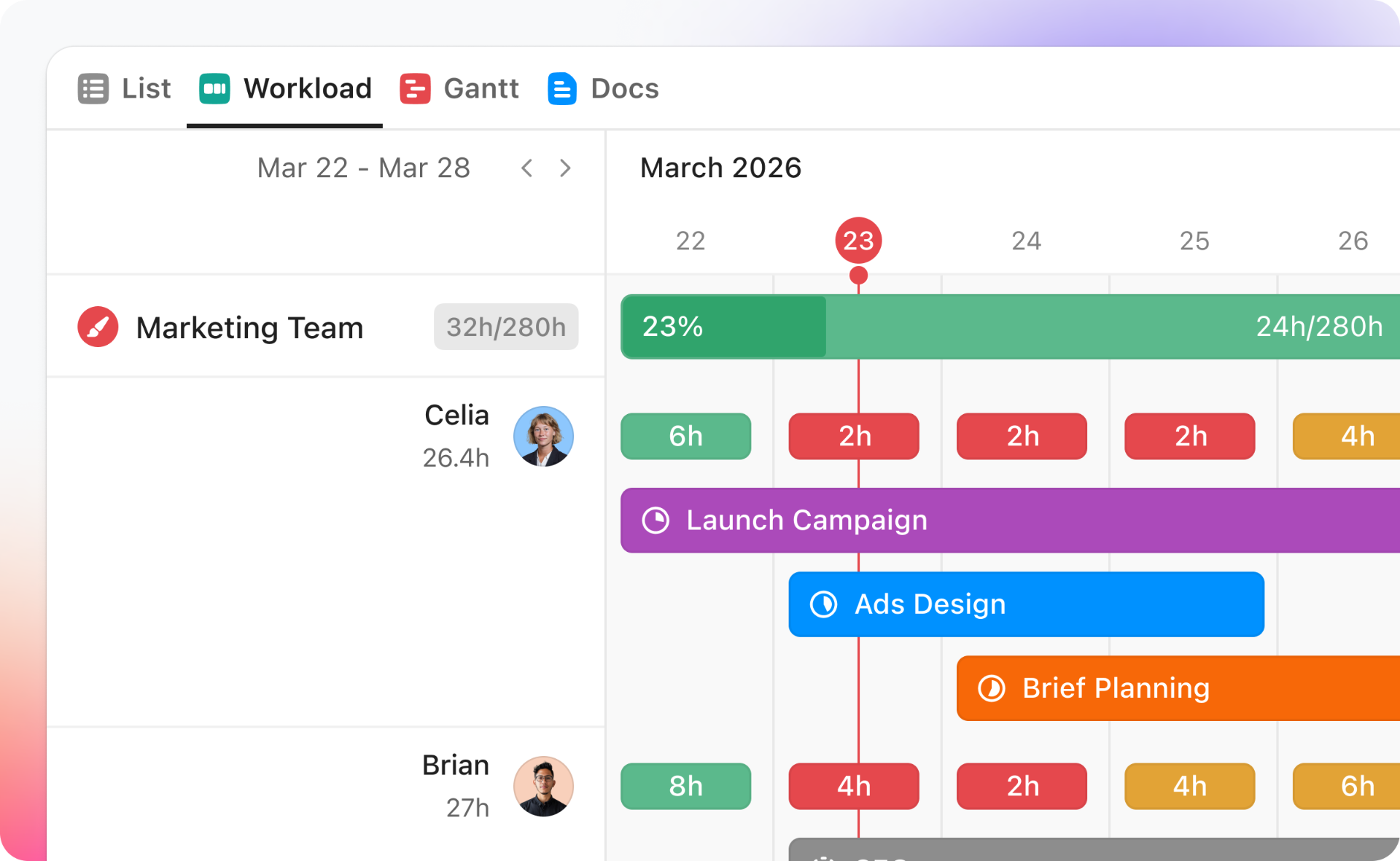 Add a second grouping layer in Workload view to break down capacity by team, project, or department, then by assignee. Quickly spot who's at capacity and where there's room, so you can prioritize and assign work faster.